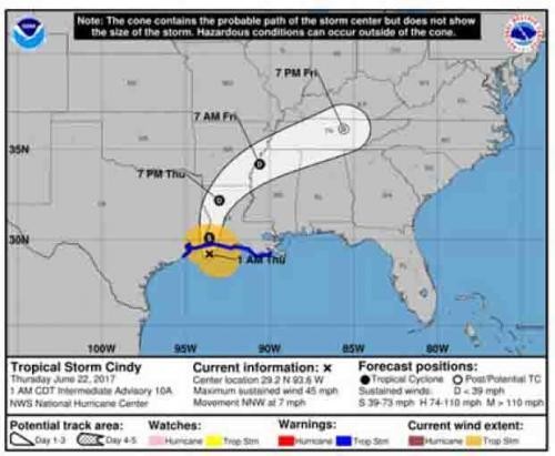 他在报告中称,“油价还会继续下跌,但是我们今早注意到热带风暴Cindy将在德州和路易斯安那州边界沿岸登陆,虽然只是热带风暴而不是飓风,但仍然能使墨西哥湾地区油气运营关停。该风暴将朝北部和东部运动,带来大量降水,但还未引起油气设施的损坏。但是热带风暴Cindy的出现向每个人发出警报:现在将要进入‘飓风季节’。”